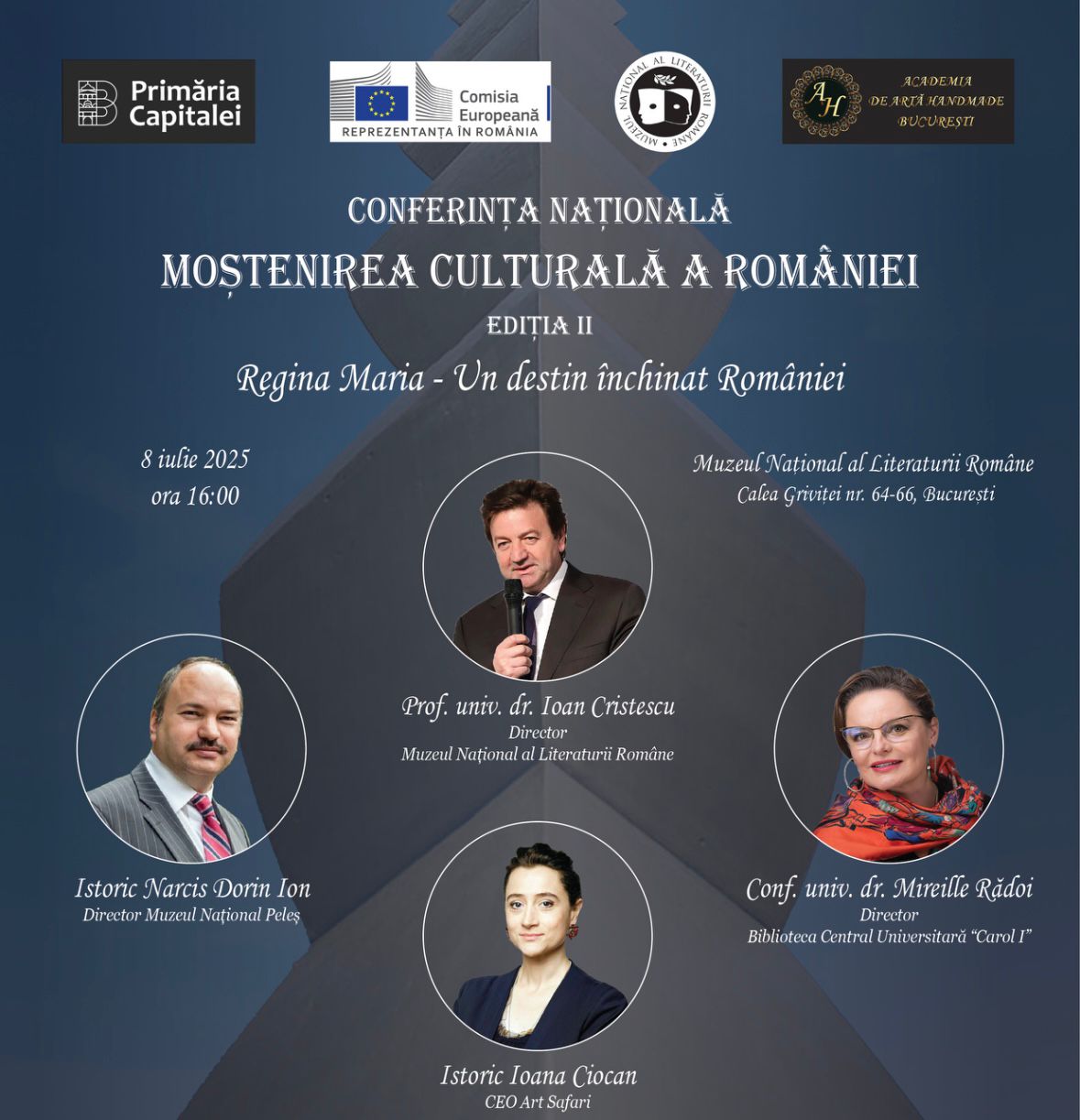 Directorul Bibliotecii Centrale Universitare „Carol I”, conf. univ. dr. Mireille Rădoi, a participat marți, 8 iulie 2025, la cea de-a doua ediție a Conferinței Naționale „Moștenirea culturală a României”, organizată la sediul Editurii Muzeului Național al Literaturii Române din București. Tema centrală a acestei ediții a fost personalitatea Reginei Maria, omagiată în contextul aniversării a 150 de ani de la naștere.