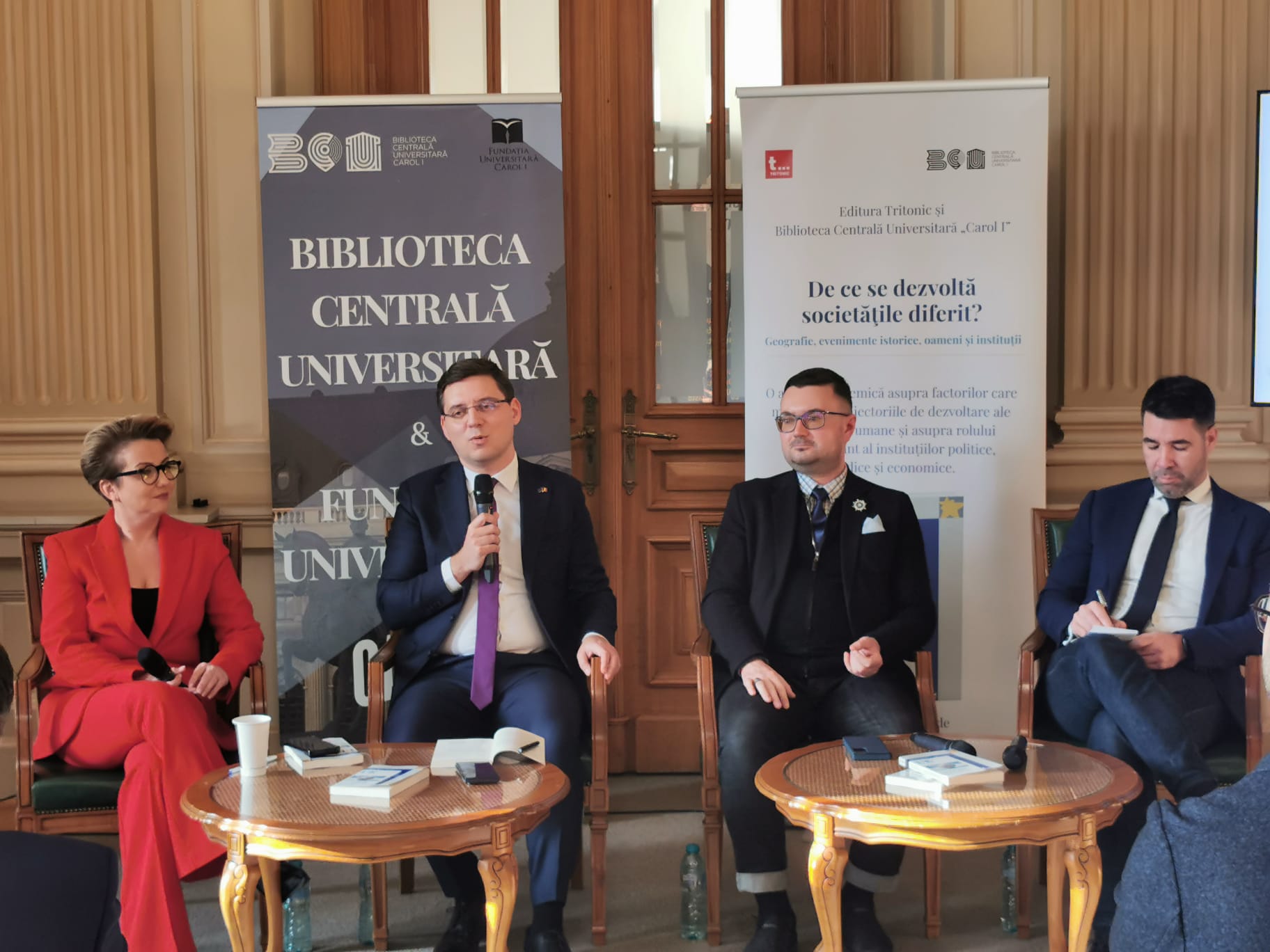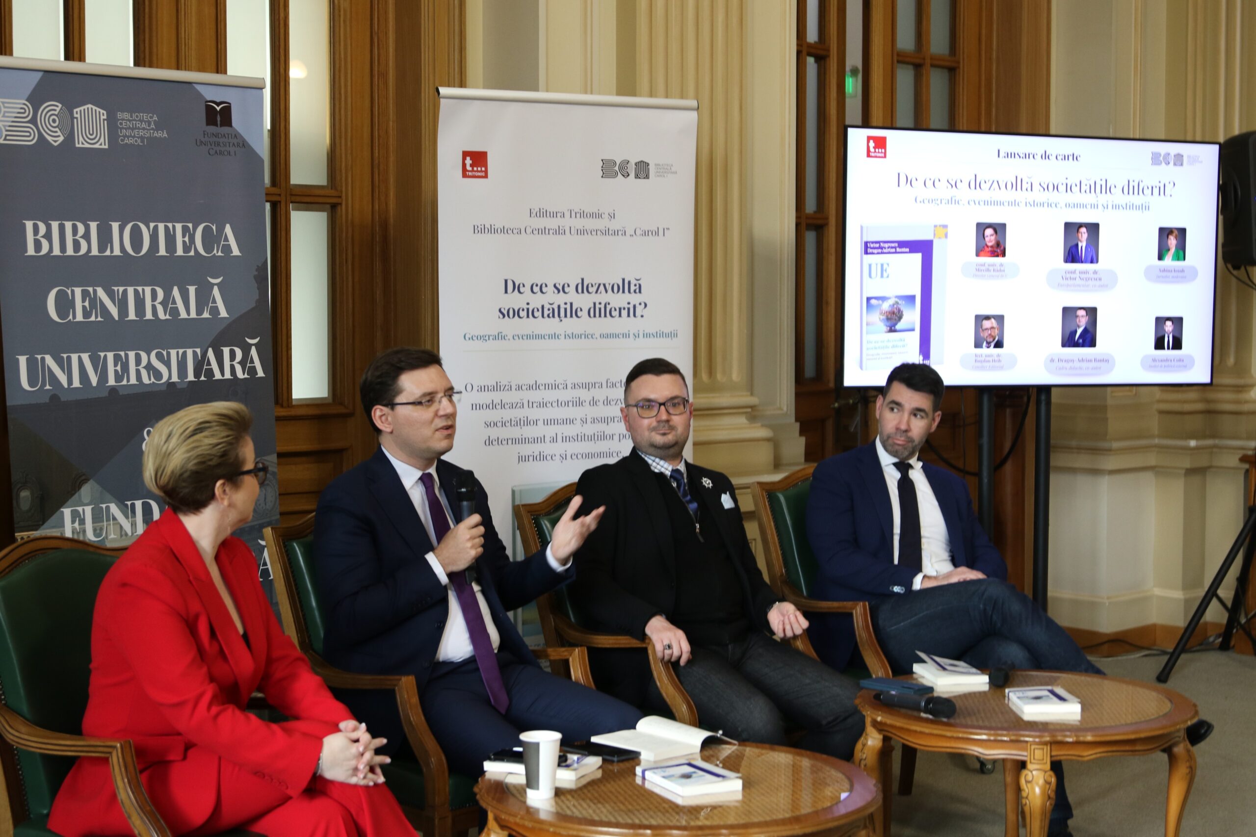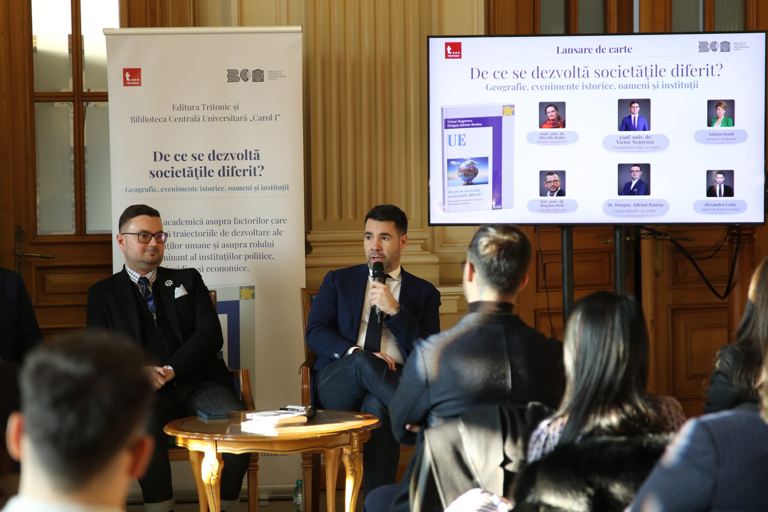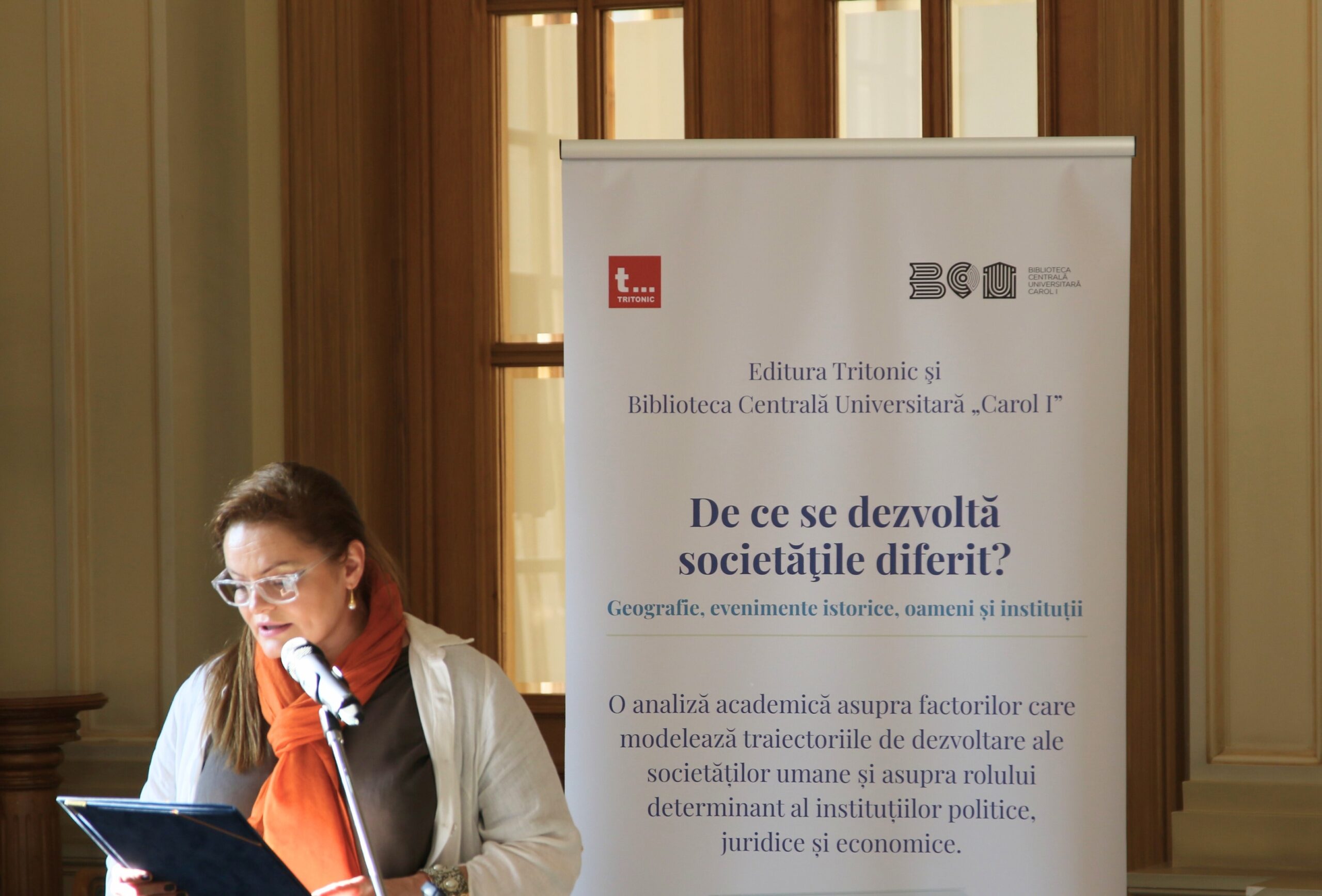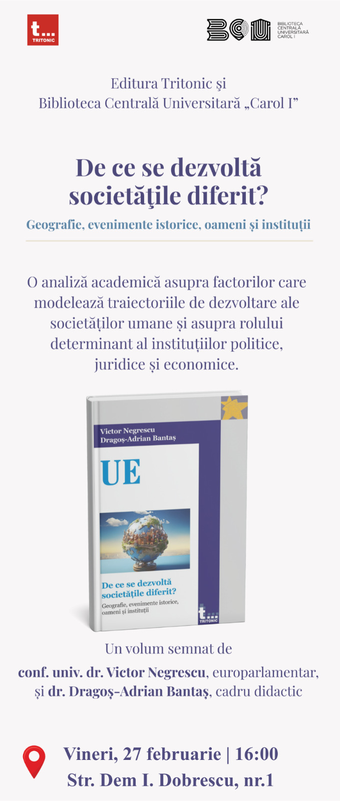 Vineri, 27 februarie 2026, ora 16:00, Biblioteca Centrală Universitară „Carol I”, în parteneriat cu Editura Tritonic, organizează lansarea volumului „De ce se dezvoltă societățile diferit? Geografie, evenimente istorice, oameni și instituții”.