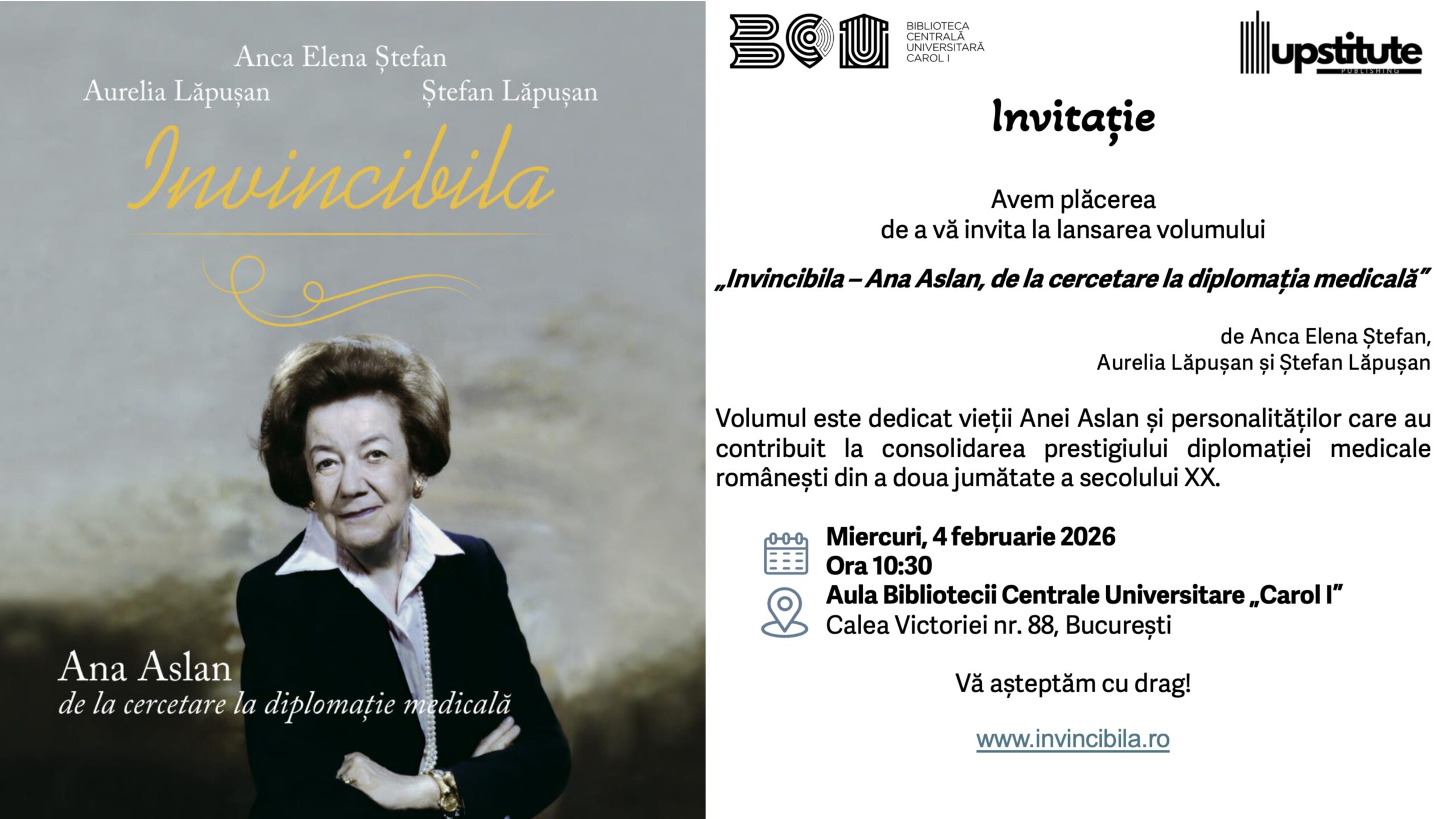 Volumul „Invincibila – Ana Aslan, de la cercetare la diplomația medicală”, semnat de Anca Elena Ștefan, Aurelia Lăpușan și Ștefan Lăpușan, propune o abordare riguroasă și nuanțată a uneia dintre cele mai influente personalități ale științei medicale românești din secolul al XX-lea.