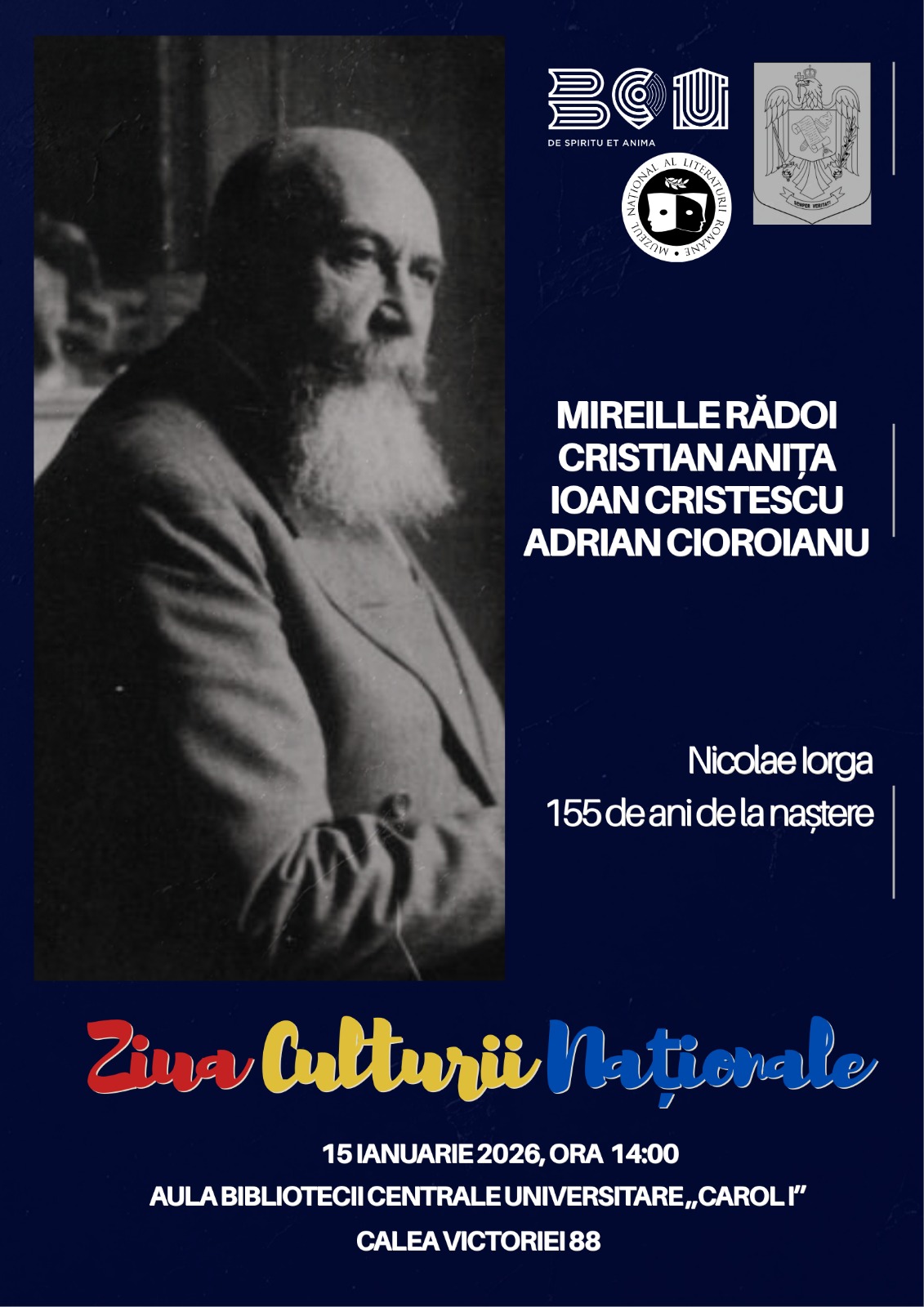 Joi, 15 ianuarie 2026, Biblioteca Centrală Universitară „Carol I”, în colaborare cu Arhivele Naționale ale României și Muzeul Național al Literaturii Române, a organizat conferința „Nicolae Iorga: 155 de ani de la naștere”, eveniment dedicat Zilei Culturii Naționale. Manifestarea a avut în centru opera și personalitatea lui Nicolae Iorga, într-un cadru de reflecție și dialog academic.